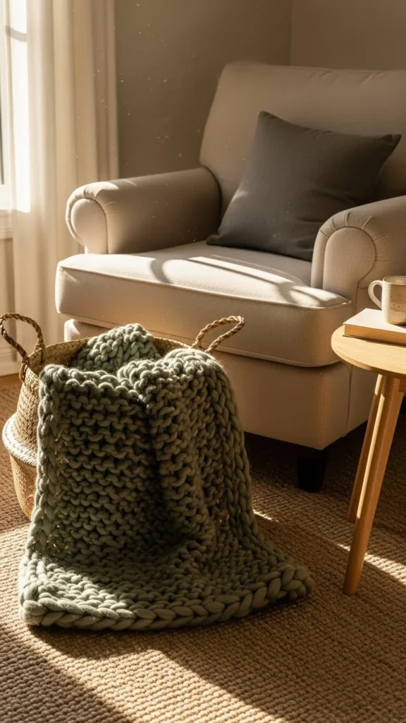 A textured green throw in a decorative basket adds warmth, comfort, and a grounding seasonal touch.