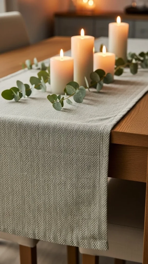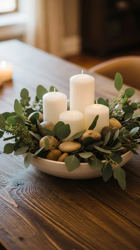 A simple eucalyptus-and-candle centerpiece feels serene and timeless. It blends beautifully into minimalist and modern homes.