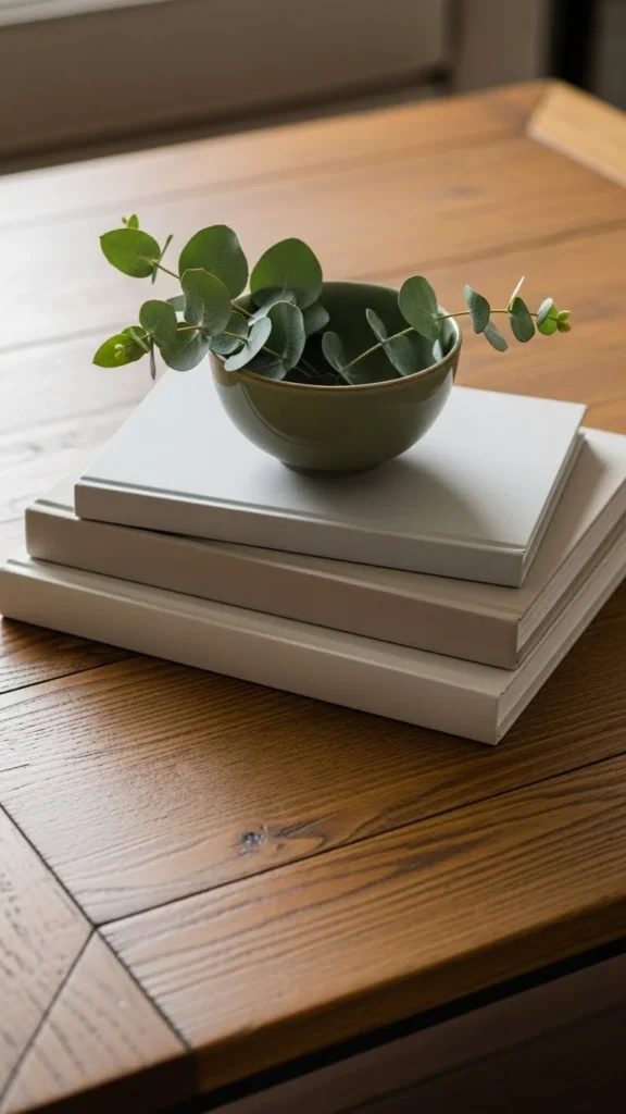 - Surround with neutral books or candles.