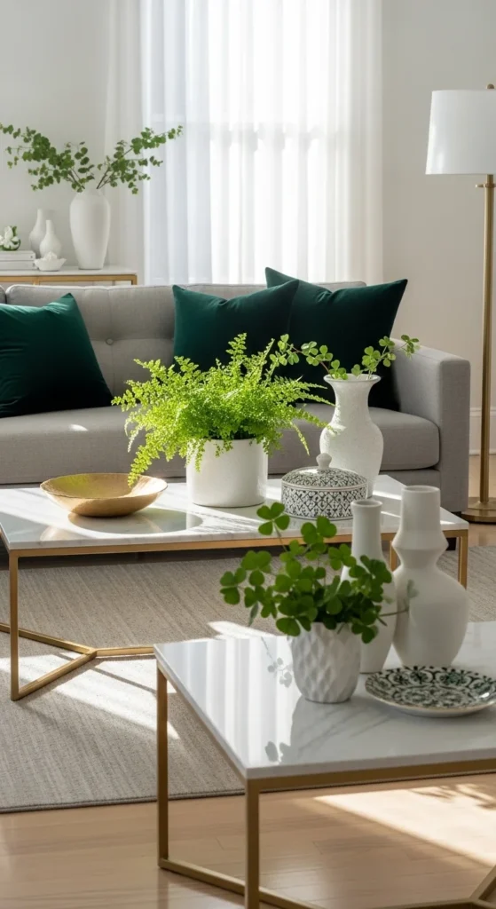 Emerald pillows instantly elevate a living room by adding richness and depth without overwhelming your décor. The color nods gently to St Patrick’s Day while remaining refined enough for everyday use.