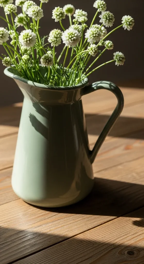 A sage ceramic pitcher doubles as both a functional serving piece and a chic decorative item. Its natural tone blends easily into elegant St Patrick’s Day décor without overpowering the room.