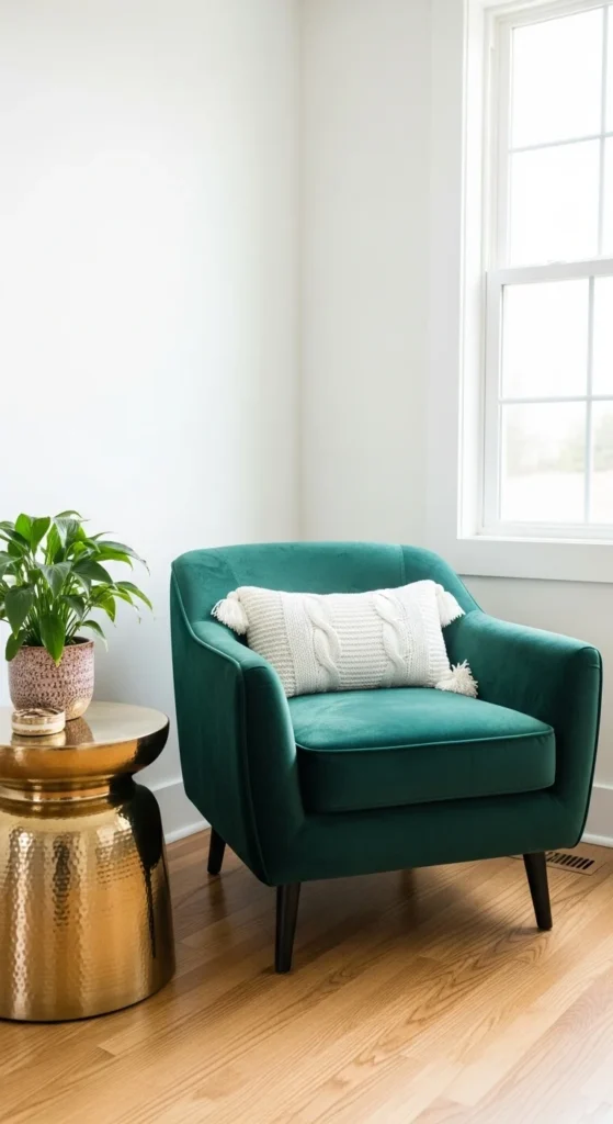 A green velvet chair adds luxury and a stunning focal point that fits beautifully with classy St Patrick’s Day décor. It’s a piece that elevates the entire room instantly.