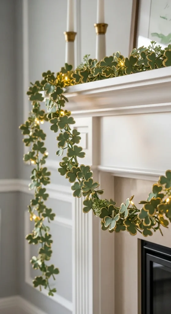 This refined shamrock garland adds holiday charm without looking childish, thanks to metallic edging and muted tones. It’s perfect for mantles, entryways, or shelves when you want a gentle hint of St Patrick’s Day spirit.