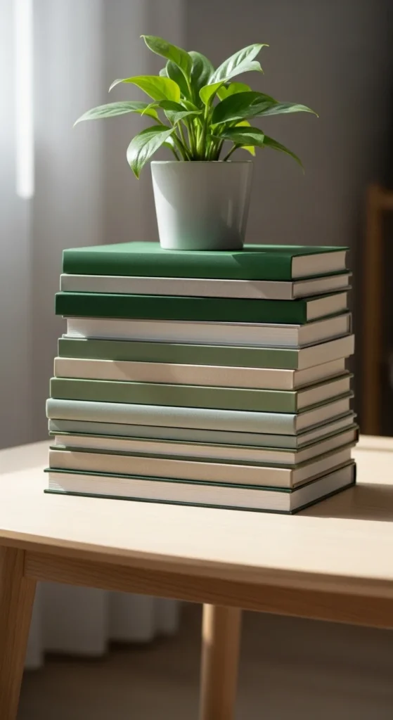 Thrift green books for cheap. Mix greens with neutrals for a balanced palette. Works great on coffee tables, nightstands, or shelves. Swap the plant for a small gold accent for a festive twist.