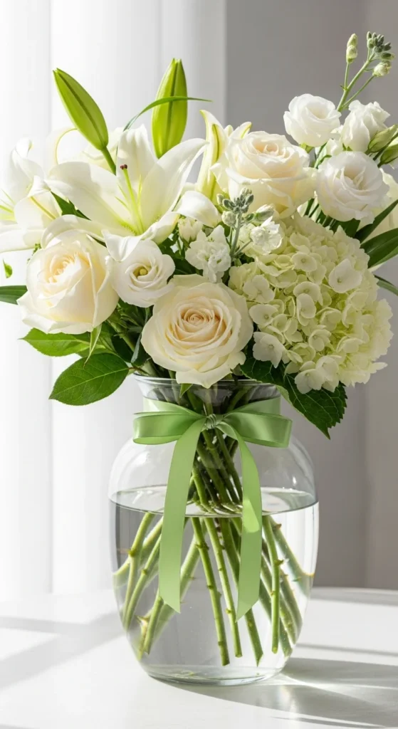 White flowers keep the look elegant. Use satin or linen ribbon for a softer effect. Works great on mantels, tables, or entryways. Add a second vase for symmetry if desired.