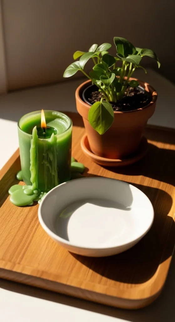 Use unscented candles if placing near food areas. Add just one or two greenery sprigs for a natural touch. Works beautifully on a coffee table, bathroom counter, or bedside table. For evening gatherings, dim the lights and let the glow create an elevated vibe.