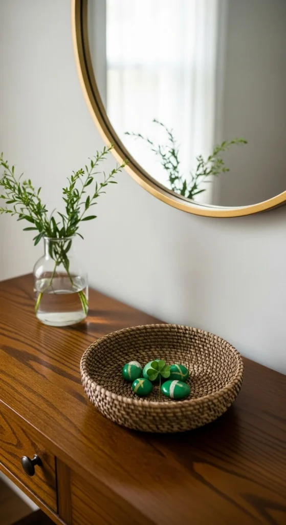 A woven or wooden bowl adds warmth. Keep the greenery tall for a natural, elevated look. Use tiny shamrock accents sparingly so it stays classy. Works great in small apartments too.