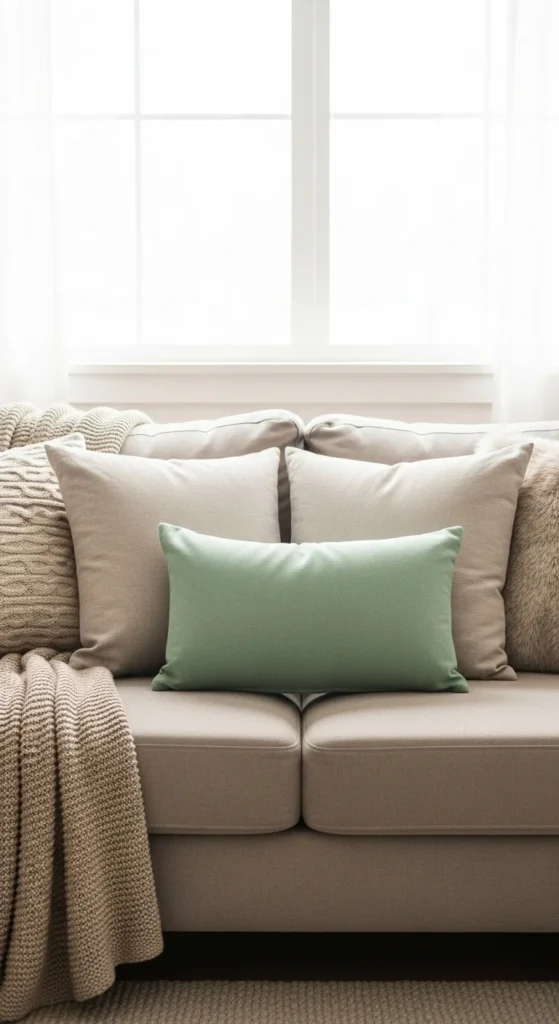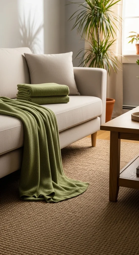 Choose muted greens for a classy look. Mix textures—linen, boucle, or cotton. Works in small apartments or larger living rooms. Add a woven basket nearby to store extra blankets.