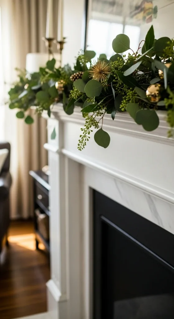 Let the garland drape slightly over the edge. Stick to soft greens for a delicate look. Light candles for evening coziness. Works even if you don’t have a mantel—place on a console table instead.