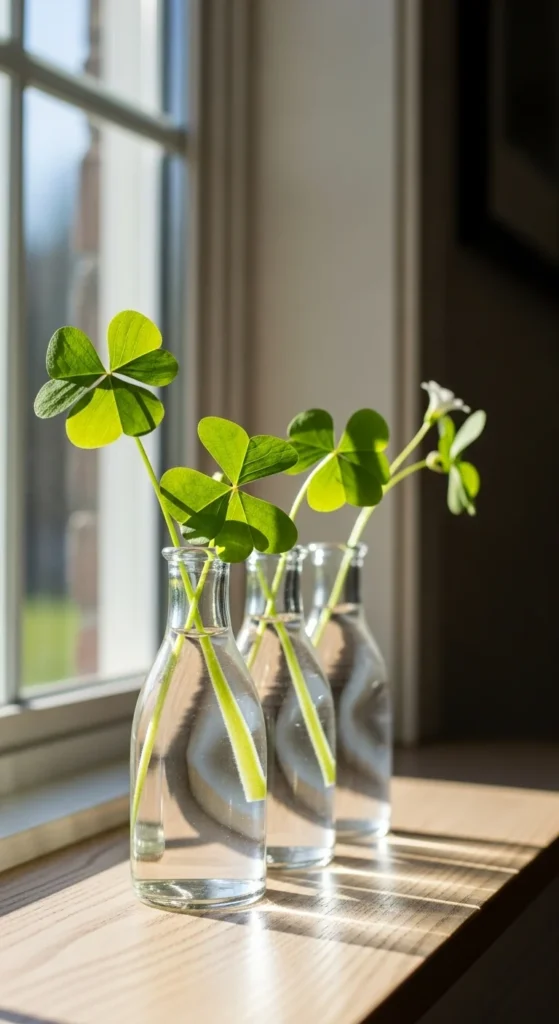 Use soft greenery to keep the look natural. Add a second shamrock plant if your shelf is wider. Stick to neutral tones so the greens stand out. Keep clutter minimal—this decor works because it’s intentional and airy. Place near a window for the prettiest natural light.