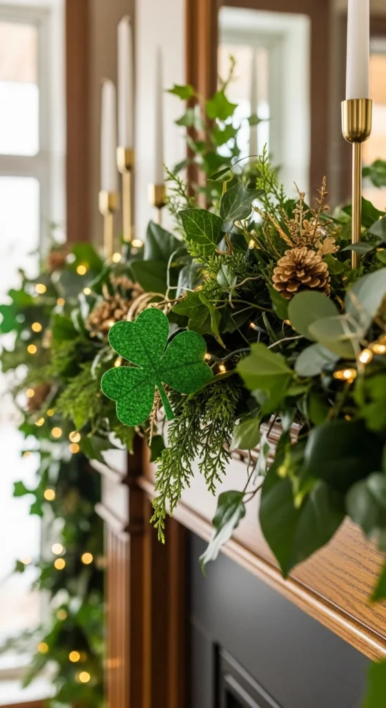 A charming and simple way to dress up any mantel, this shamrock garland brings together greenery, texture, and soft glow, creating a fresh focal point for your St. Patrick’s display. The layered leaves and warm lighting help the arrangement feel both trendy and timeless.