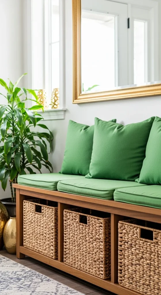 This styled bench creates a welcoming, polished look that blends everyday utility with festive green tones.