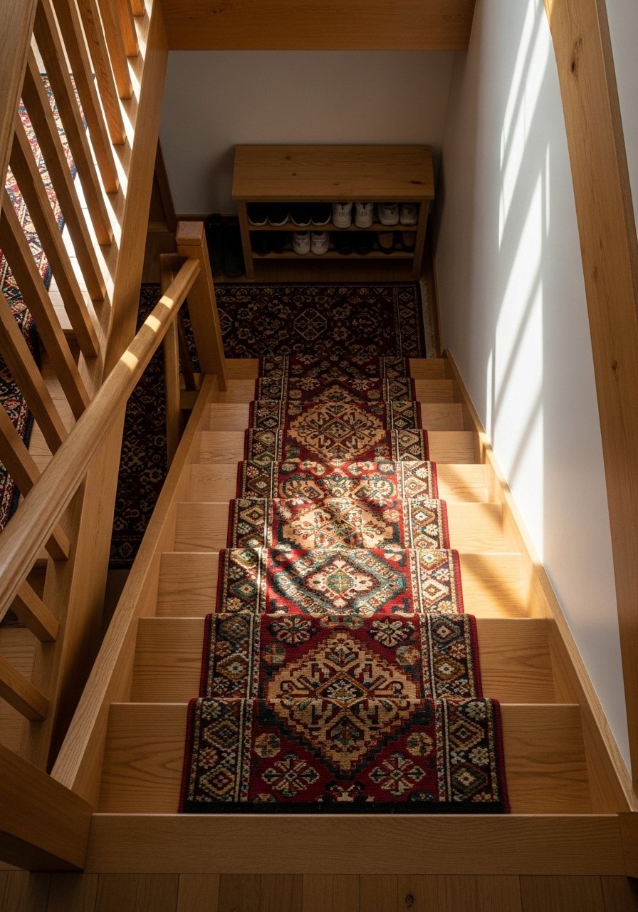 My stairs used to be a wasted vertical plane. Adding a kilim runner introduced pattern, texture, and grip. Expect $120 to $500. The styling rule is to keep the runner centered and leave about 2.5 to 3 inches of wood border on each side. Cheap runners often shift and look sloppy. Use a non-slip underlay and a 5×24 kilim runner for a busy pattern. In narrow stairs pick thinner runners to avoid a cramped look.