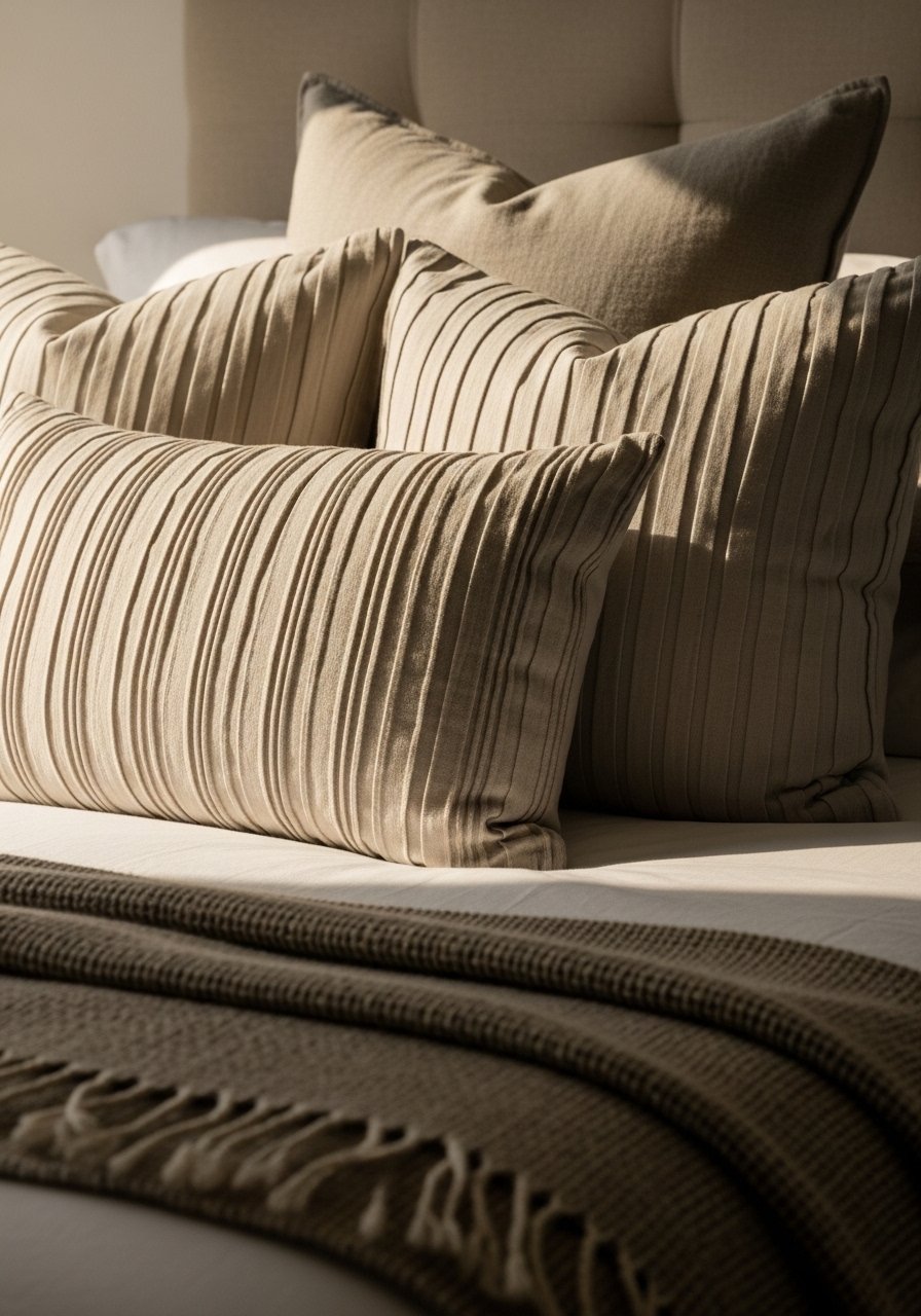 A friend asked me about cushion layouts for a queen bed. Pleated cushions add shadow and depth. Use odd numbers and scale: two euro pillows, three cushions, one lumbar. Budget $20 to $90. The cheap mistake is matching all fabrics. Mix a pleated velvet with a flat linen and a printed cushion. I bought pleated cushion covers and a linen set to layer. In studio apartments limit to three cushions so sleeping remains easy.