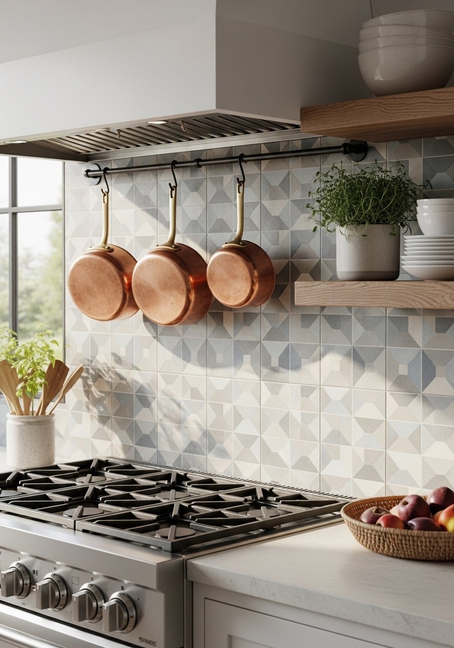 Every showroom I walk into features patterned tile with a matte finish now. Matte reduces glare and shows texture better than gloss. Budget $200 to $1200 depending on coverage. The common mistake is choosing high-gloss patterns that look great in photos but reflect too much light. I installed a small geometric matte tile behind my range and paired it with open wood shelving. Consider matte patterned ceramic tile for a subtle statement.