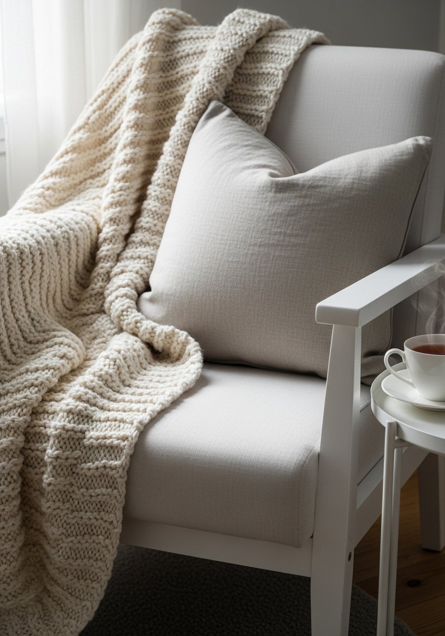 I built a reading corner with a cream chunky knit throw and a linen lumbar pillow for texture. I used this cream chunky knit throw and a 20×12 linen pillow cover from Target for an approachable layered look. The mix feels warm without adding color. Mistake to avoid: too many small pillows — stick to an odd number and vary heights for balance. The result is soft, inviting, and quietly modern.