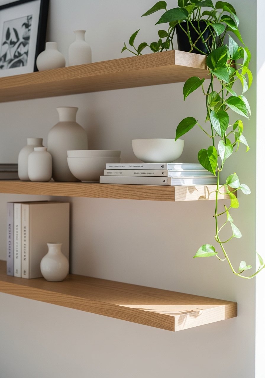 Floating white oak shelves keep a white wall from feeling sterile. I installed these white oak floating shelves and styled them in odd numbers: three pots, two books, one frame. I like ceramic pitchers and a faux pothos for low-maintenance greenery. Common mistake: overcrowding shelves. Leave breathing room to let white space work. This pairing of warm wood and white feels current and airy.