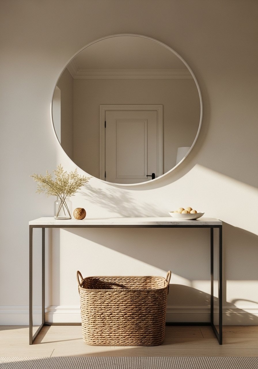 A large round mirror opens up tight entries instantly. I leaned into this 36-inch round mirror above a slim white console and added a woven basket. Mirrors reflect light and double as wall decor. Mistake to avoid: hanging too high — center it at eye level. This trick makes a small space feel larger and more intentional.