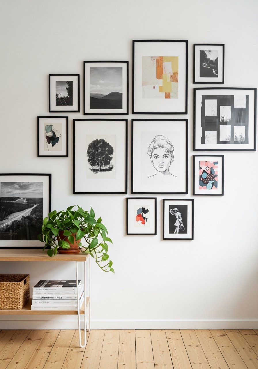I created a curated gallery wall using black frames and monochrome prints for crisp contrast on white walls. I thrifted frames and used fresh white mats; then I filled gaps with small ceramic accents. Tip: use white picture mats to make thrifted frames read modern. Avoid hanging frames too close together — spacing matters. The result is clean, graphic, and surprisingly warm.