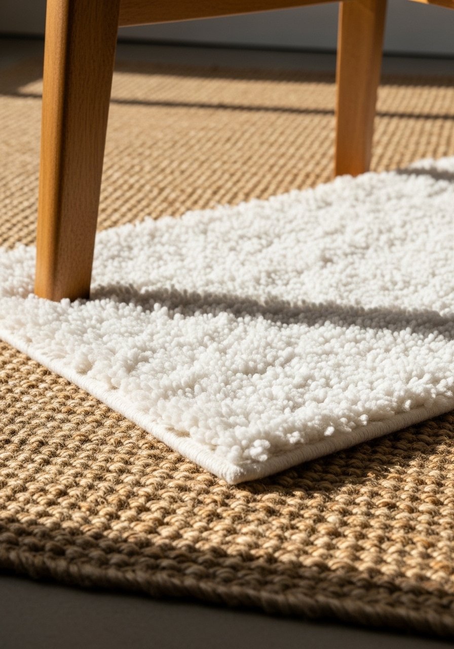 I layered a soft white wool rug over a larger jute base to get the best of both worlds: plush underfoot and durable underneath. I used an 8×10 jute rug with a 5×7 white wool rug on top for zoning. I avoid wall-to-wall white rugs in high traffic zones — the jute protects the white. This combo creates warmth and keeps white looking intentional, not precious.