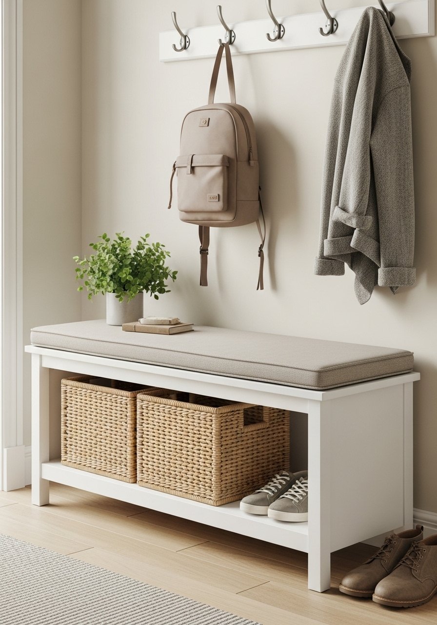 I added a white bench with concealed storage to keep an entry crisp. I used a 36-inch bench and a woven basket below for shoes and seasonal gear. I recommend a white storage bench with soft-close hinges. Mistake to avoid: leaving storage open — it defeats the clean look. This keeps clutter hidden and preserves a calm, airy welcome.