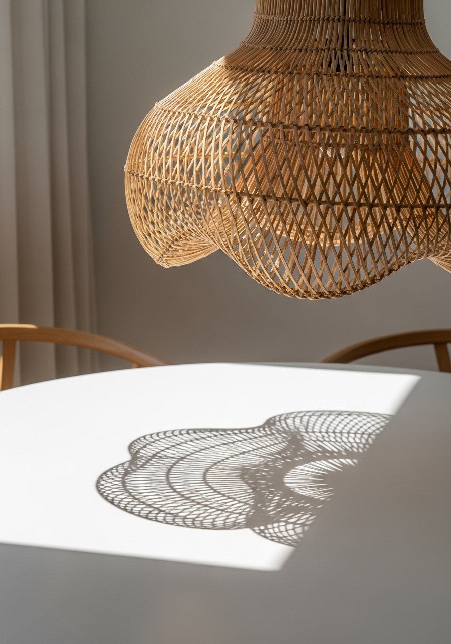 A sculptural pendant brings interest to an all-white ceiling and creates soft shadow play. I swapped a basic dome for a woven rattan shade and noticed the room felt more intentional. Consider this rattan pendant shade. Mistake to avoid: choosing a pendant that's too small — proportion matters. The right fixture becomes the focal point without adding color.
