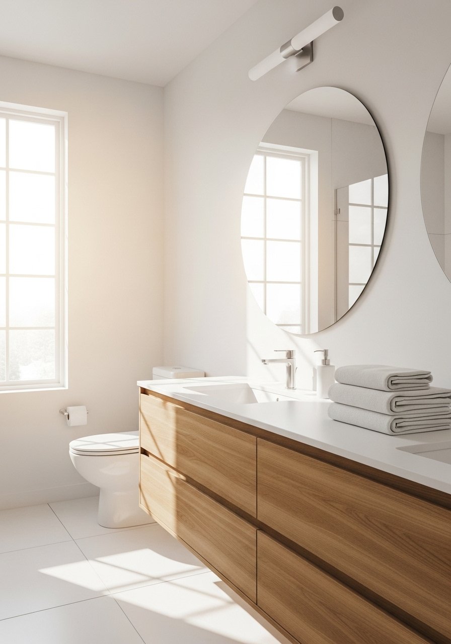 White Bathroom with Warm Wood Vanity