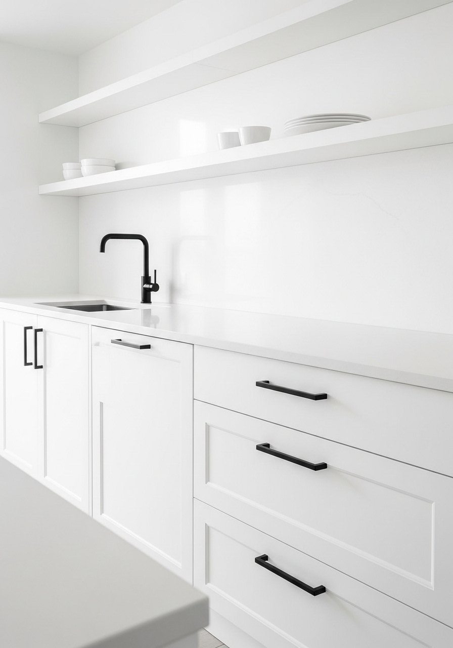 White on white kitchen styling is crisp when you add black accents for contrast. I swapped handles to matte black and added a black faucet for graphic interest. I love black matte cabinet pulls for a small, powerful update. Mistake to avoid: too many white accessories — introduce one strong contrasting tone to anchor the space. This combo reads modern and edited.