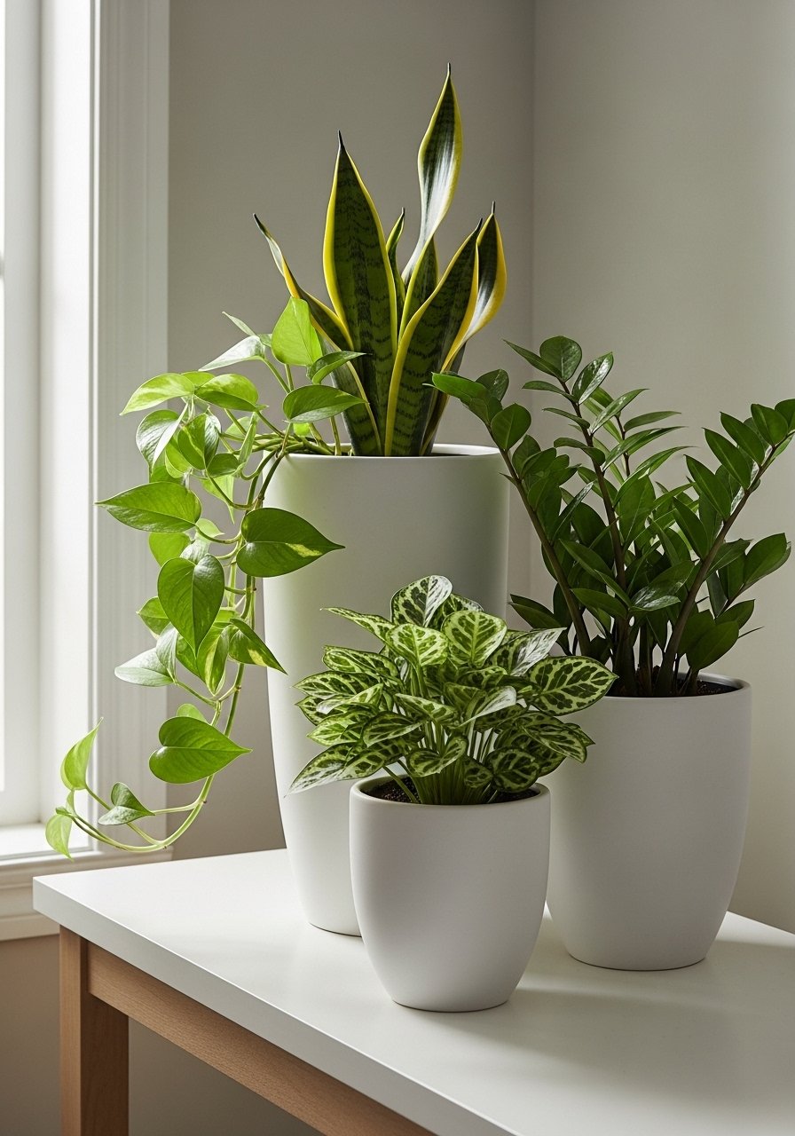 I grouped white ceramic planters in staggered heights for a sculptural plant display. I used a tall faux fiddle leaf and two small succulents. The white planters keep the eye on form and foliage. I recommend white ceramic planters set. Mistake to avoid: matching planter sizes — vary scale for rhythm. This keeps greenery from overwhelming a white palette.