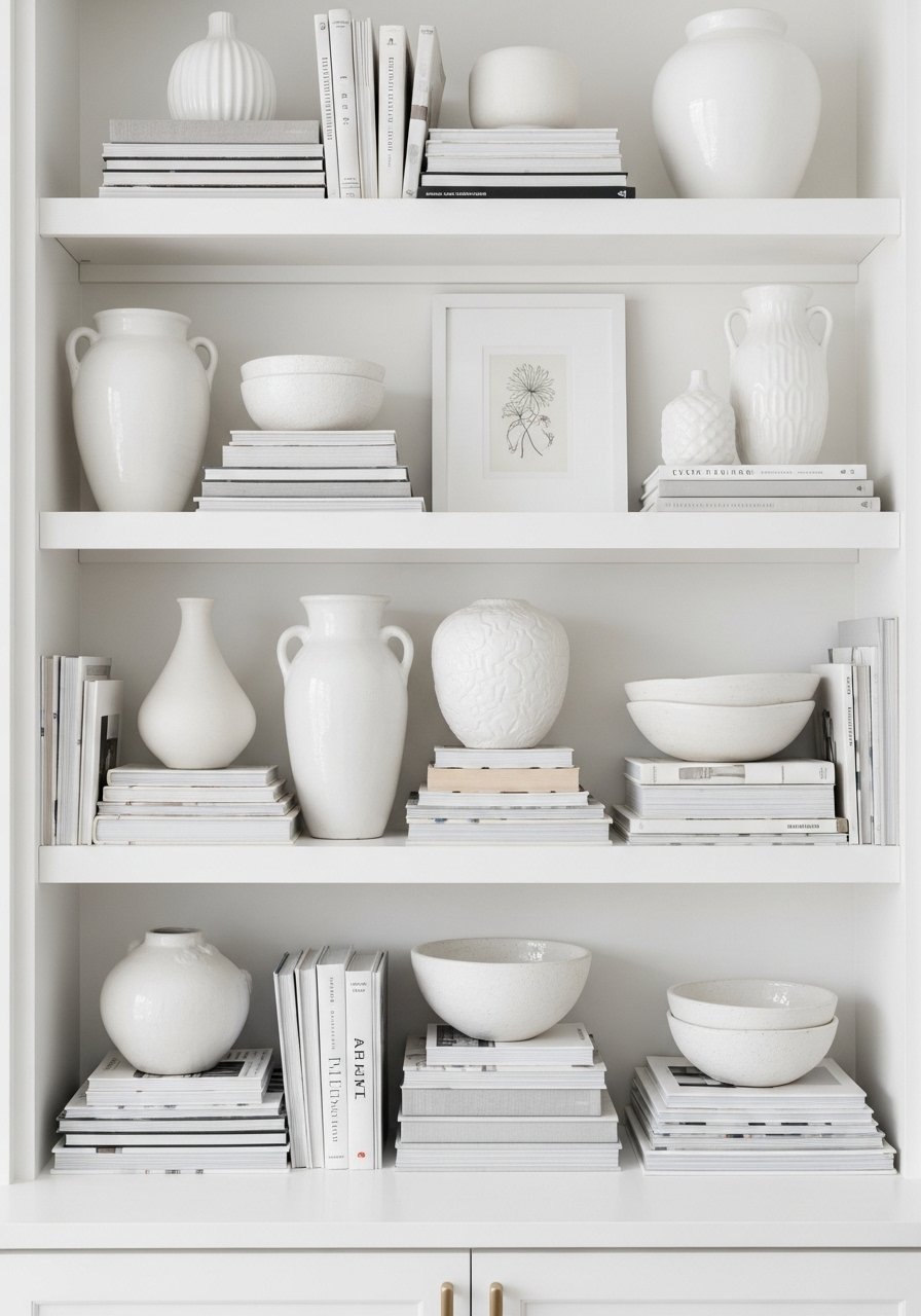 I styled open white shelving with horizontal book stacks, white ceramics, and a single green accent to avoid monochrome monotony. I follow a 3:1 ratio — three books, one object — for rhythm. I used white bookends to keep things tidy. Mistake to avoid: overfilling shelves; negative space is the secret. The shelves feel collected and calm, not cluttered.