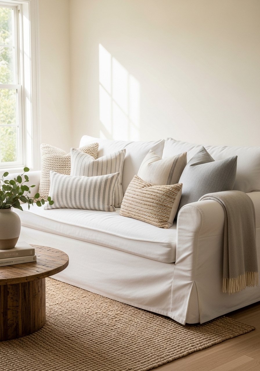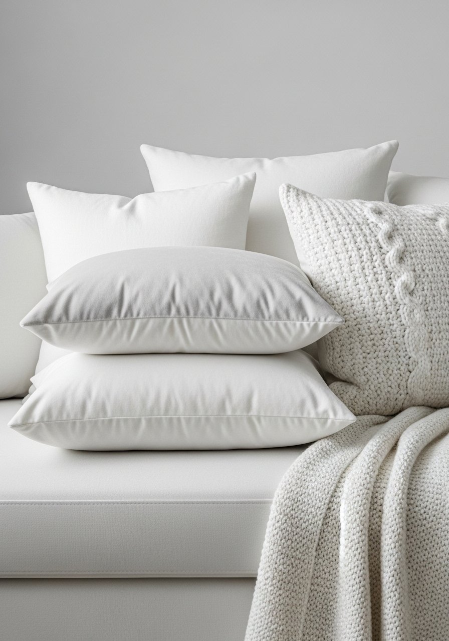 I mix linen, velvet, and knit white pillow covers in odd numbers for a layered sofa. I used a set of four velvet covers, two linen shams, and one chunky knit lumbar. I buy inserts in varying sizes — 22-inch euros for backs, 18-inch fronts. Try velvet pillow covers set. Mistake to avoid: matching every pillow — texture contrast is what makes white feel rich and intentional.