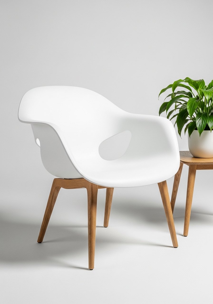 I added a white molded accent chair with warm wood legs to break up a sea of upholstery. The chair's silhouette reads sculptural and light. I chose a 26-inch-wide chair that tucks nicely into corners. Mistake to avoid: choosing a chair that’s visually heavy — light frames keep the room airy. This piece adds a modern edge to a soft white palette.