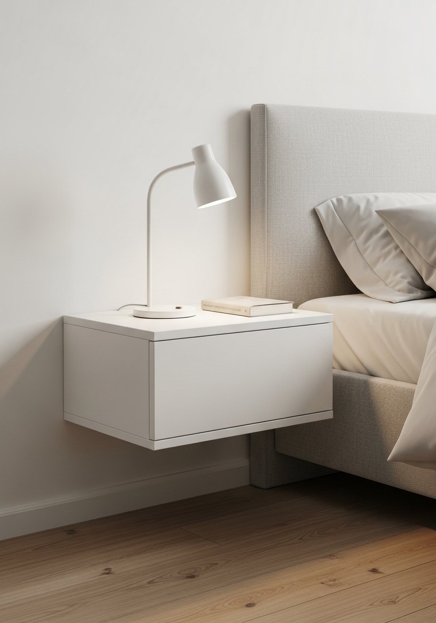 Floating nightstands free up visual space in small bedrooms. I installed 18-inch white floating units and styled them with a slim lamp and an alarm clock. I recommend floating nightstand wall shelf. Mistake to avoid: mounting too low — keep them level with the mattress top. The effect is minimal, practical, and keeps a white room feeling uncluttered.