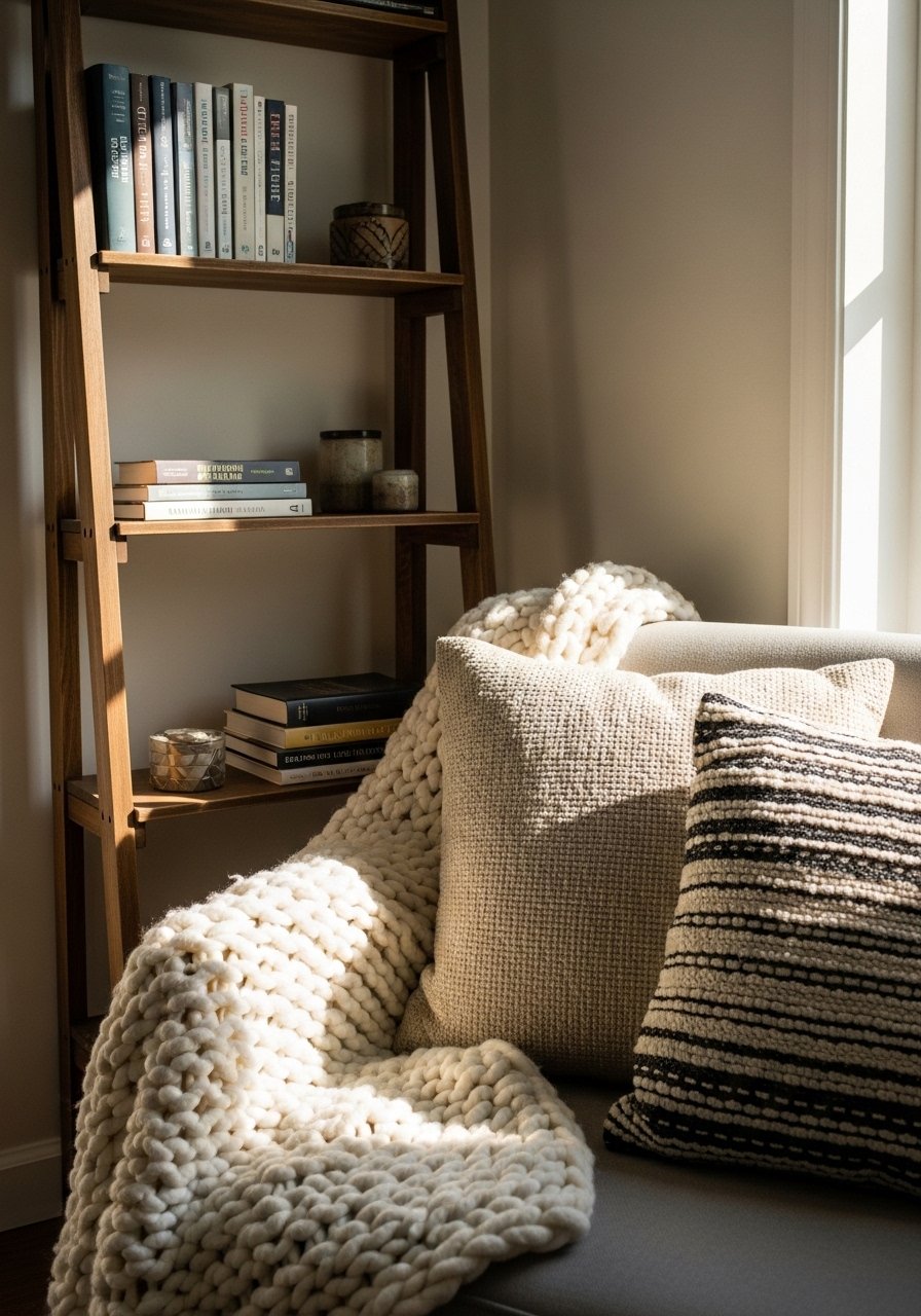 The moment I draped a chunky knit over an armchair, the nook felt usable not staged. For a cozy vibe, use a 60-30-10 ratio: 60 percent neutral upholstery, 30 percent textured pillows and throws, 10 percent a bold color. Works best in living rooms and bedrooms. Budget $40-200. Avoid too many smooth fabrics together. Smooth silk plus sleek leather reads cold in person. Try a cream chunky throw and mix linen pillows with one velvet option. Odd numbers of pillows look intentional.