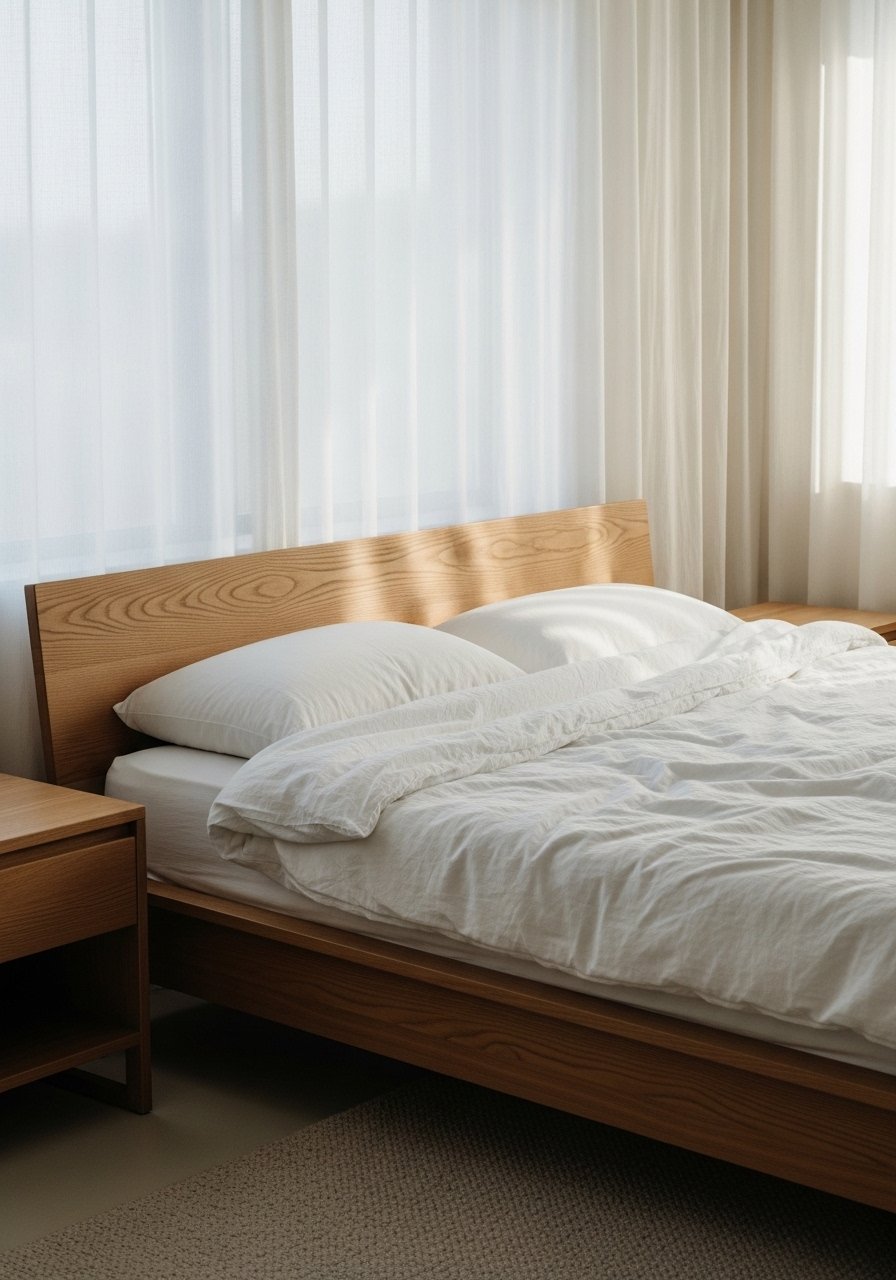 A simple wooden bed frame sets a restful tone. I prefer a low-profile frame with exposed grain. Budget $200-900. A too-dark stained bed can overpower a small room. Choose lighter woods like white oak or ash for small bedrooms. I bought a natural oak bed frame and paired it with linen bedding. In photos it looks clean, in person the grain adds the lived-in warmth I want.