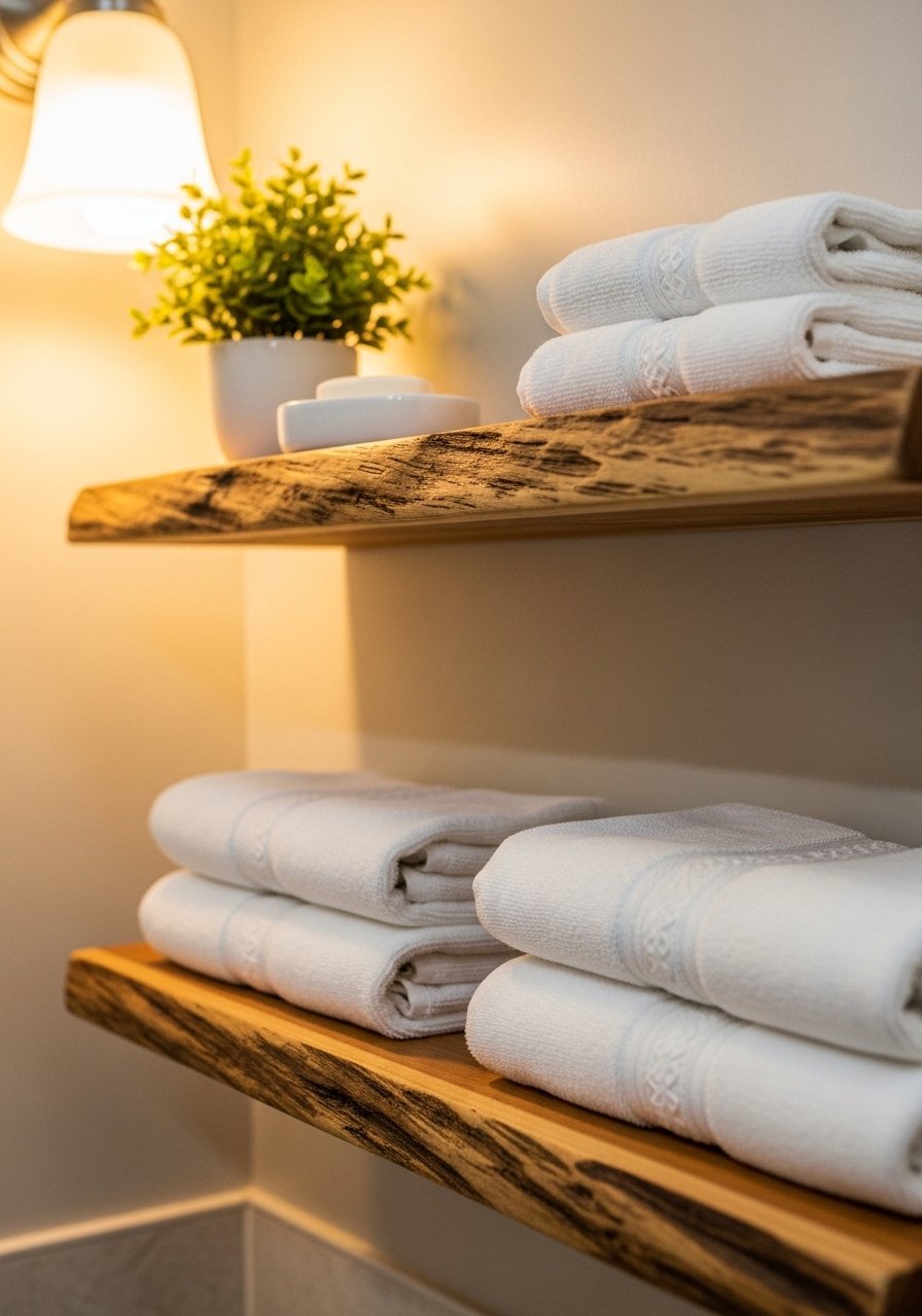 A live-edge shelf in a bathroom brings an unexpected tactile note. I added two shelves above towels and the space instantly read more spa-like. Use sealed wood to resist moisture. Budget $60-200 per shelf. Untreated wood will warp in humid bathrooms. I recommend sealed live-edge shelves and keep spacing at 10 inches to hold folded towels comfortably. Pair with rattan baskets and neutral ceramics.