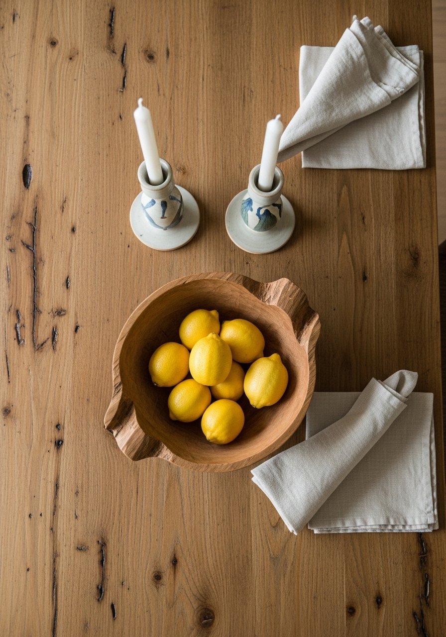 Hand-carved bowls are inexpensive anchors for a dining table. I use one at the center with fruit or seasonal objects. Budget $20-120. Avoid tiny trinket bowls that get lost in photos. Choose a bowl at least 10-12 inches across for presence. A hand-carved wooden bowl pairs well with linen napkins and simple ceramics. In real life it becomes a working catchall.