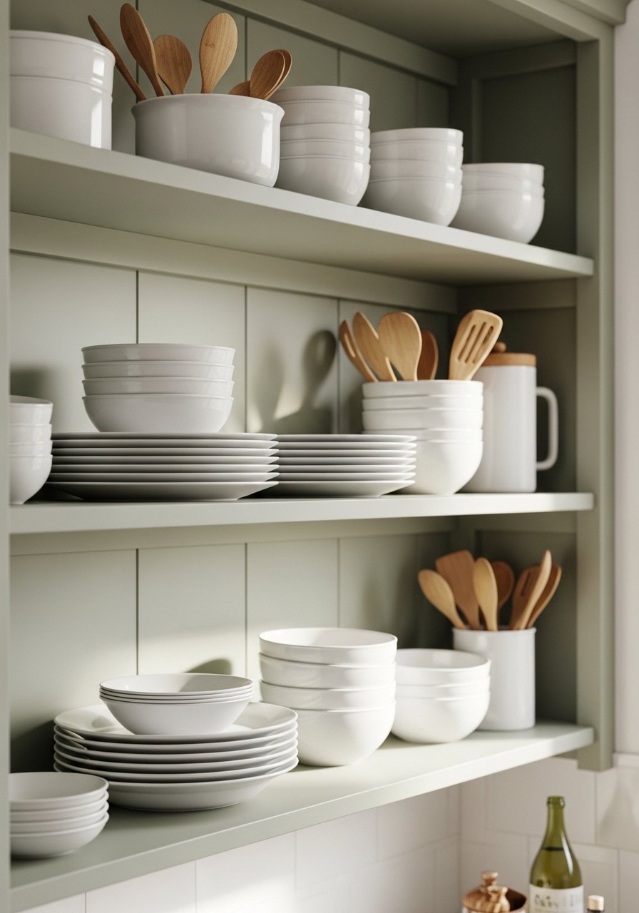 I used painted wooden shelves when I wanted a softer statement than raw wood. Soft sage or warm greige is current for 2026. Budget $20-150 depending on shelving. The mistake is painting over visible wood grain when you want texture. Either embrace full paint for color or choose natural wood to show grain. For a budget pick, painted wood floating shelves are an easy swap. Pair with white ceramics and brass hooks for contrast.